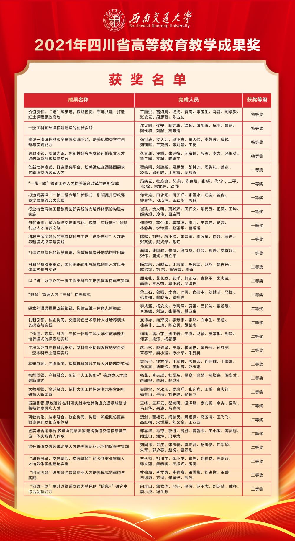 近日,四川省人民政府公布了2021年四川省教学成果奖名单。澳门十大信誉好的网站主持获批四川省高等教育教学成果奖特等奖4项、一等奖7项、二等奖17项,获特等奖数量全省第二。另外参与获批特等奖1项、二等奖3项。在本届四川省高等教育教学成果奖获奖率减少30%的前提下,学校主持获奖总数较上届增加2项,获奖数量占全省比例提高17%。