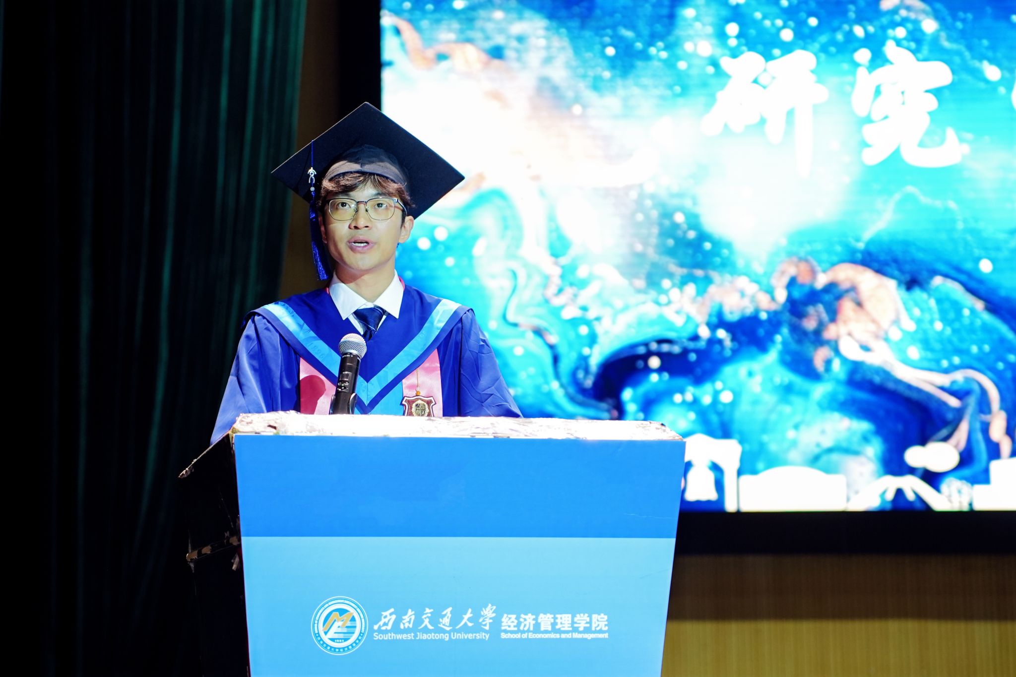 本科生毕业生代表毛宇欣、研究生毕业生代表李若晨、MBA毕业生代表张永恒分别发言。毛宇欣回顾了自己从懵懂到成熟的大学成长经历;李若晨分享了自己在硕士阶段学术研究、实践工作等方面获得的能力提升和成长;张永恒分享了自己奔走在课堂与职场之间的求学之路,不忘初心、拥抱挑战,在前行中连接彼此、照亮他人。毕业生代表真情实感的流露,饱含着对学院老师、同窗挚友的不舍与感谢。