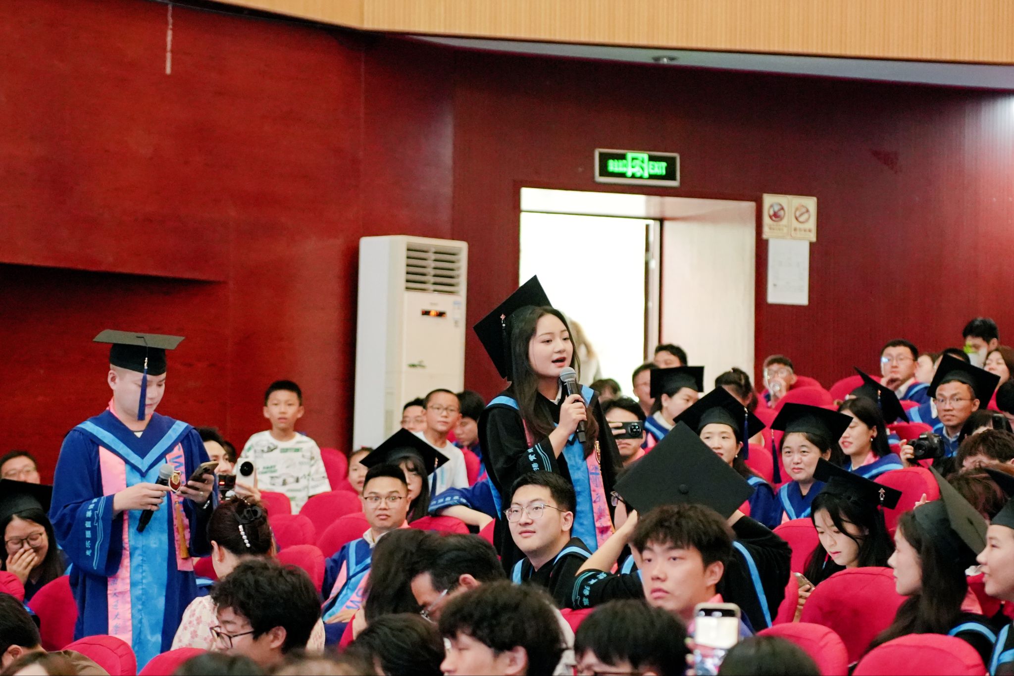 随着音乐鼓点骤然响起,惊喜快闪环节点燃全场氛围。所有毕业生随着音乐齐声合唱,歌声回荡在整个会场。