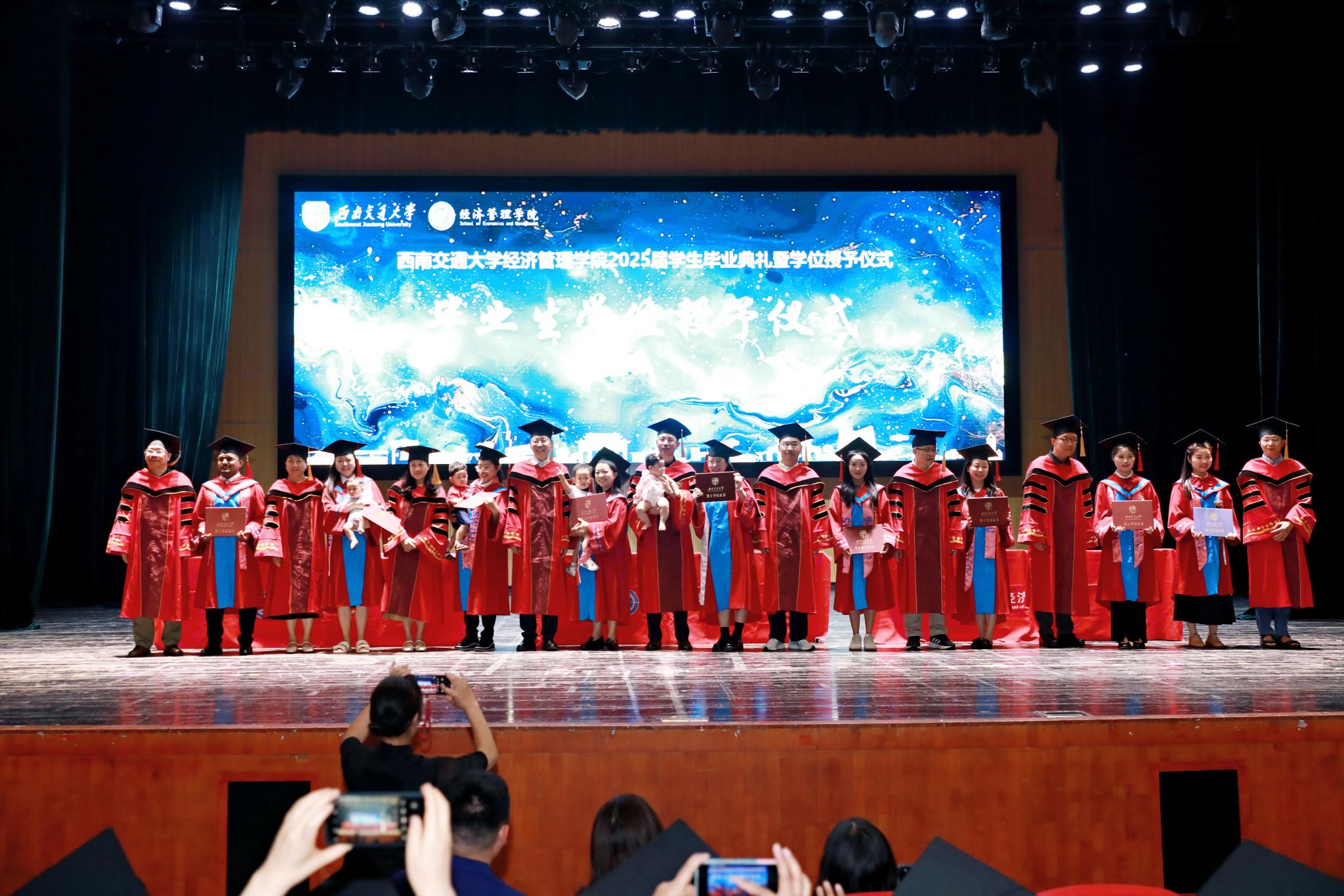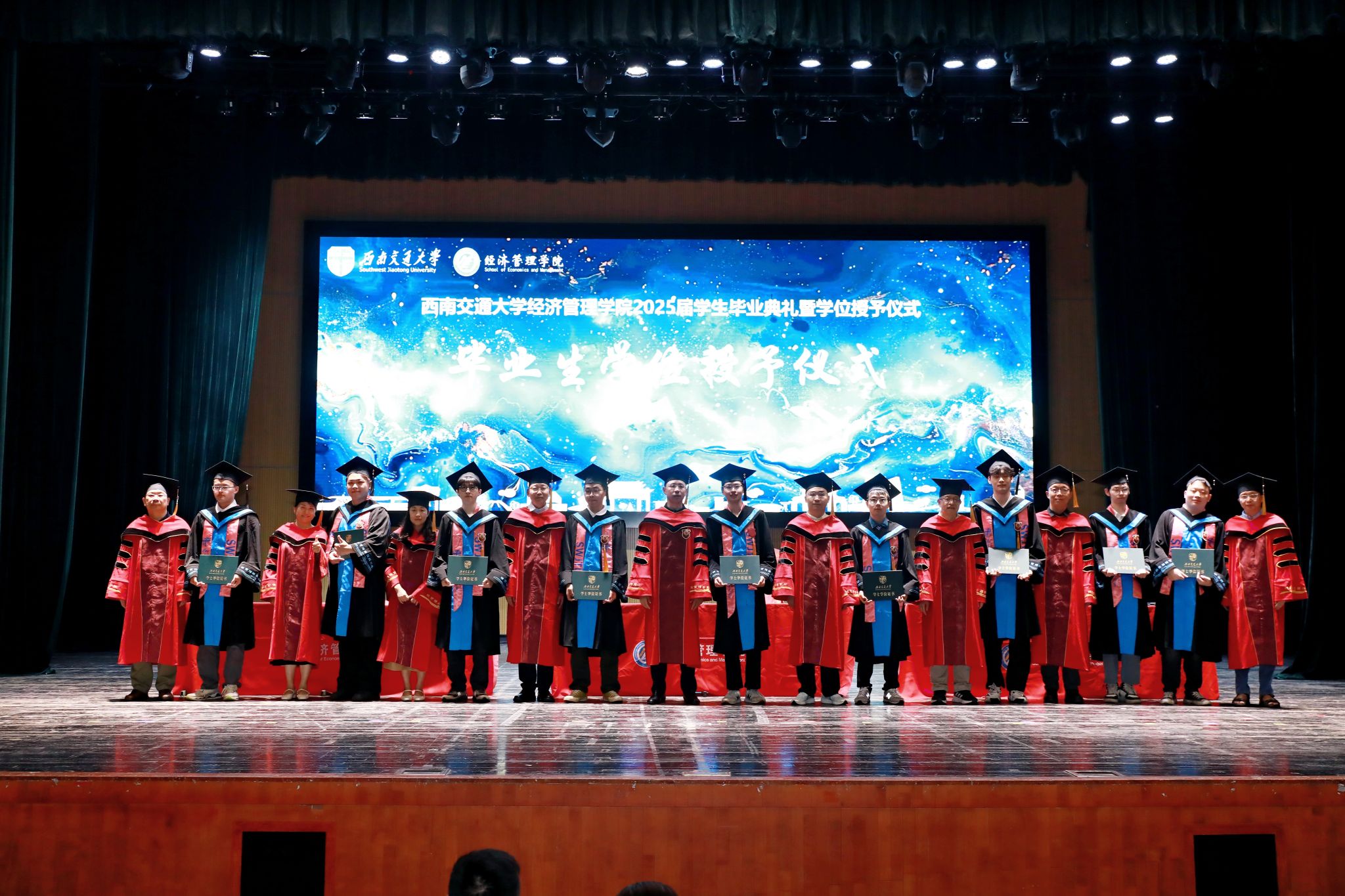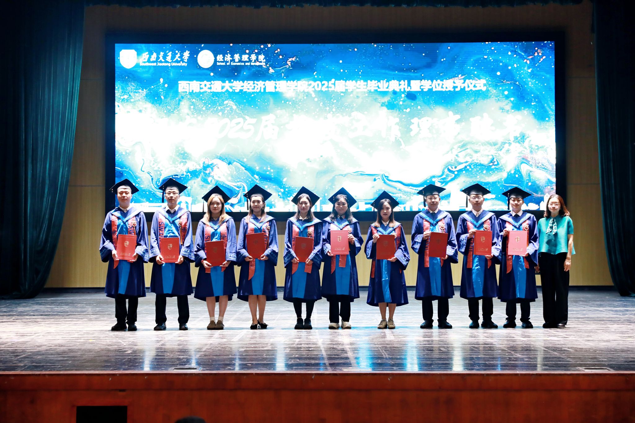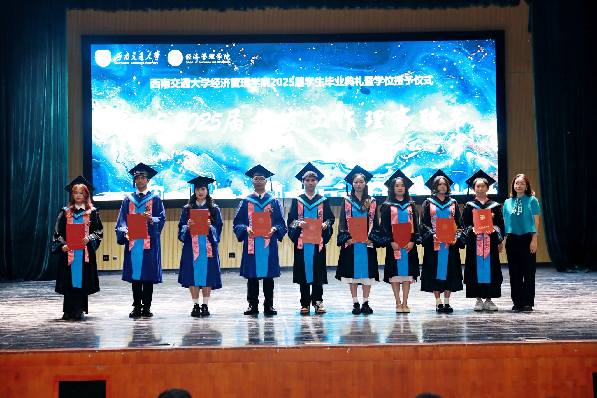 2025年6月22日上午,澳门十大信誉好的网站2025届学生毕业典礼暨学位授予仪式在九里校区学生大会堂隆重举行。学院全体领导班子成员、学院学位评定分委会委员、各系和职能部门负责人、专业负责人、教师代表、毕业生辅导员和班主任,及学院2025届全体毕业生出席本次典礼。典礼由学院党委副书记、纪委书记余小英主持。
