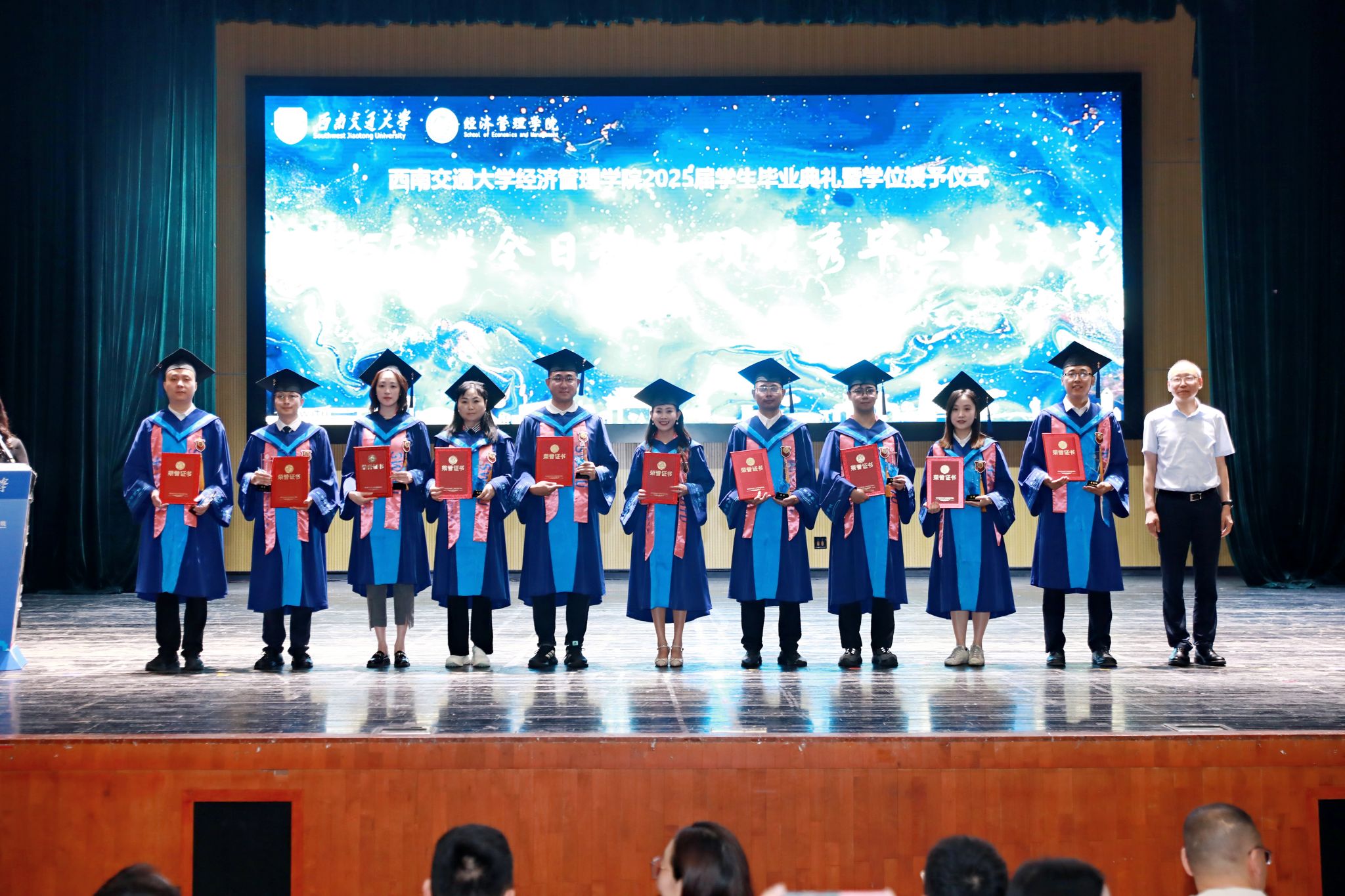 学院党委书记蒋佳宣读2025届本科生、研究生省级及校级优秀毕业生名单,学院副处级组织员晏理斌为获奖毕业生代表颁奖。省级及校级优秀毕业生严谨求知、知行合一,在知识求索与综合发展中树立榜样,让更多学子从榜样力量中汲取向上、向善、向美的动力。