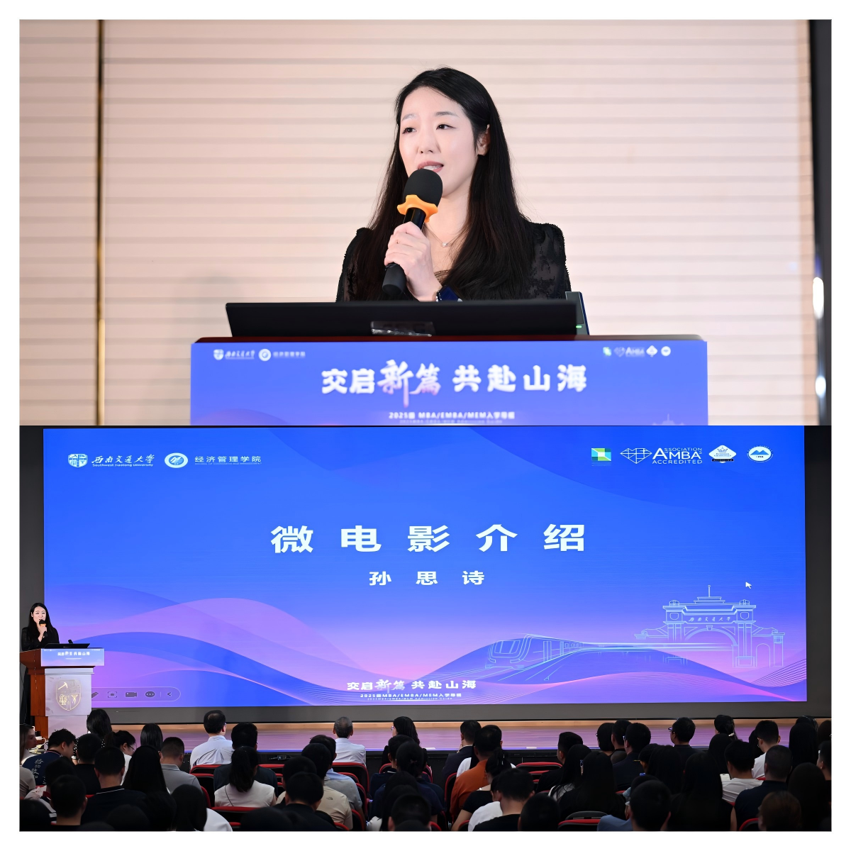 紧接着,MBA联合会副主席王汝超介绍了7个社团的创立理念及活动开展情况,鼓励新生踊跃加入。她指出,参加社团能丰富课余生活,开拓视野,还能结交志同道合的朋友,助力个人成长与未来发展。MBA联合会副主席刘林介绍了沙漠挑战赛,EMBA学长周鹏介绍了戈壁挑战赛,他们回顾了交大学子在历届比赛中的征程与佳绩,分享了参赛感受,并呼吁2025级同学积极参与拼搏,展现交大人“自强不息”的精神。