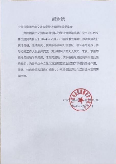 2024年2月20日,澳门十大信誉好的网站实践队在团委书记贾佳、副书记苏扬老师的带领下,前往四川省广安市开展寒假“返家乡”社会实践活动。实践队首先来到邓小平故里参观调研,感受邓小平同志的伟大人格和崇高精神。参观结束后,实践队成员们分发问卷,与游客亲切交流,收集他们的意见和建议,共同探寻红色文化的深厚底蕴。第二天,实践队继续深入广安,探访了华蓥山。在结束实地参观后,实践队与广安市金亿旅游开发有限公司总经理曾辉开展了研讨座谈会并分享了队伍对广安红色旅游发展的看法。实践活动结束后,团队收到了来自广安市金亿旅游开发有限公司的感谢信。