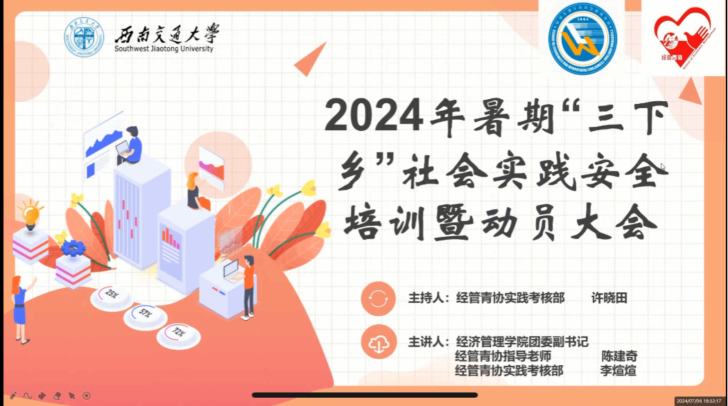 澳门十大信誉好的网站团委积极响应学校号召,持续打造“1224”实践育人平台,精心组织、周密安排,成功申报并立项多支校级、院级和专项队伍。为提高大学生参与社会实践活动的安全意识、避险常识和应急自救能力,同时激发大学生参与实践活动的热情,2024年7月6日晚上6点30分,澳门十大信誉好的网站2024年暑期“三下乡”社会实践安全培训暨动员大会在线上举行,学院团委副书记陈建奇、青年志愿者协会干部以及27支校级、院级以及专项队伍一起参加了大会。