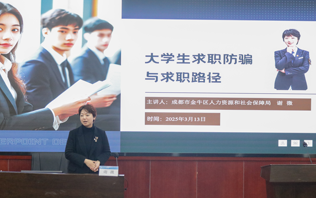 为增强学生就业安全意识,提升求职风险防范能力,2025年3月13日下午,成都市金牛区就业服务中心用工指导科科长、金牛区委组织部“星火讲师团”讲师谢微应邀为澳门十大信誉好的网站学生带来求职防骗主题讲座。此次讲座将求职正确路径与经典案例引入校园,充分实现校地资源互补,既是双方就业创业服务站建设举措的深化,也是校地合作共同筑牢就业安全屏障的有力实践。