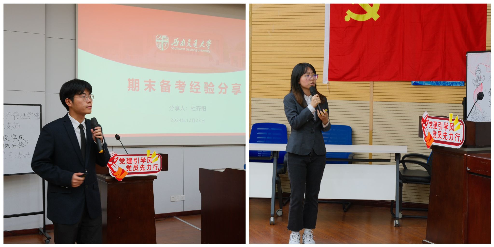 随后,支部党员杜齐阳和杨雅舒进行经验分享。杜齐阳同志介绍了部分课程的学习方法和考试注意事项。杨雅舒同志则聚焦于竞赛、科研等方面,为大家提供宝贵的信息和建议。