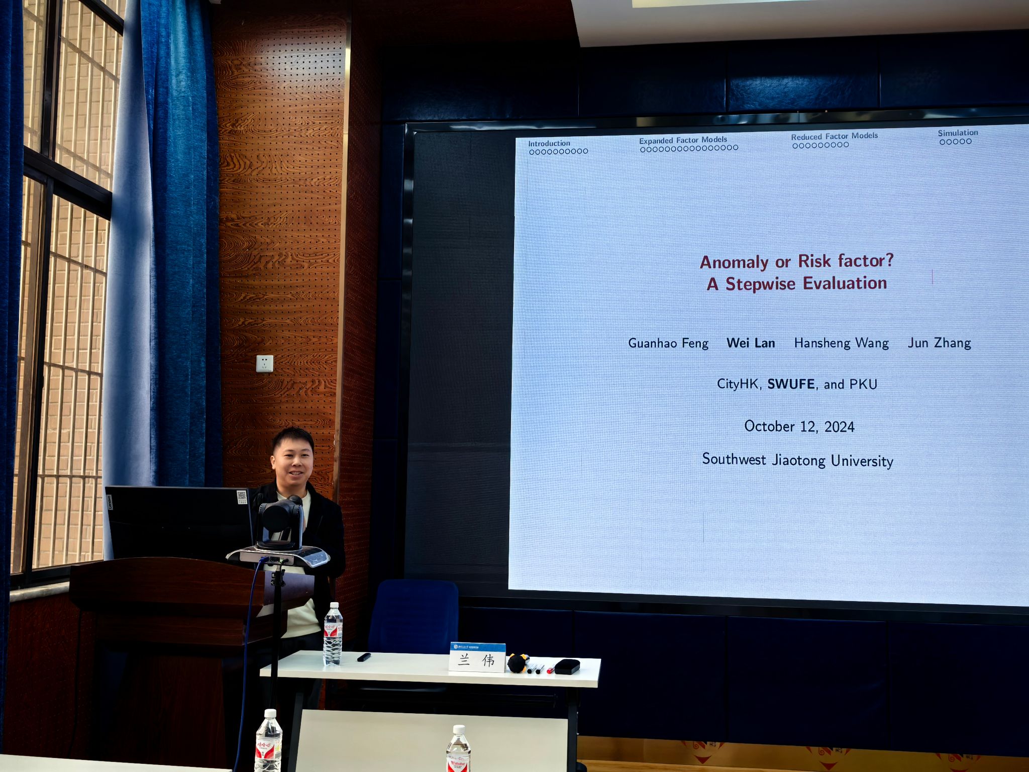 2024年10月12日上午,西南财经大学统计学院副院长兰伟教授应邀在九里校区澳门十大信誉好的网站为十大信誉官网师生带来了一场题为“大规模金融因子评估和筛选”的学术讲座。本次学术活动由十大信誉官网副院长马锋主持,学院部分教师及研究生参加此次讲座,马锋副院长介绍了兰伟教授学术成果,并对兰伟教授到来表示欢迎与诚挚的感谢。
