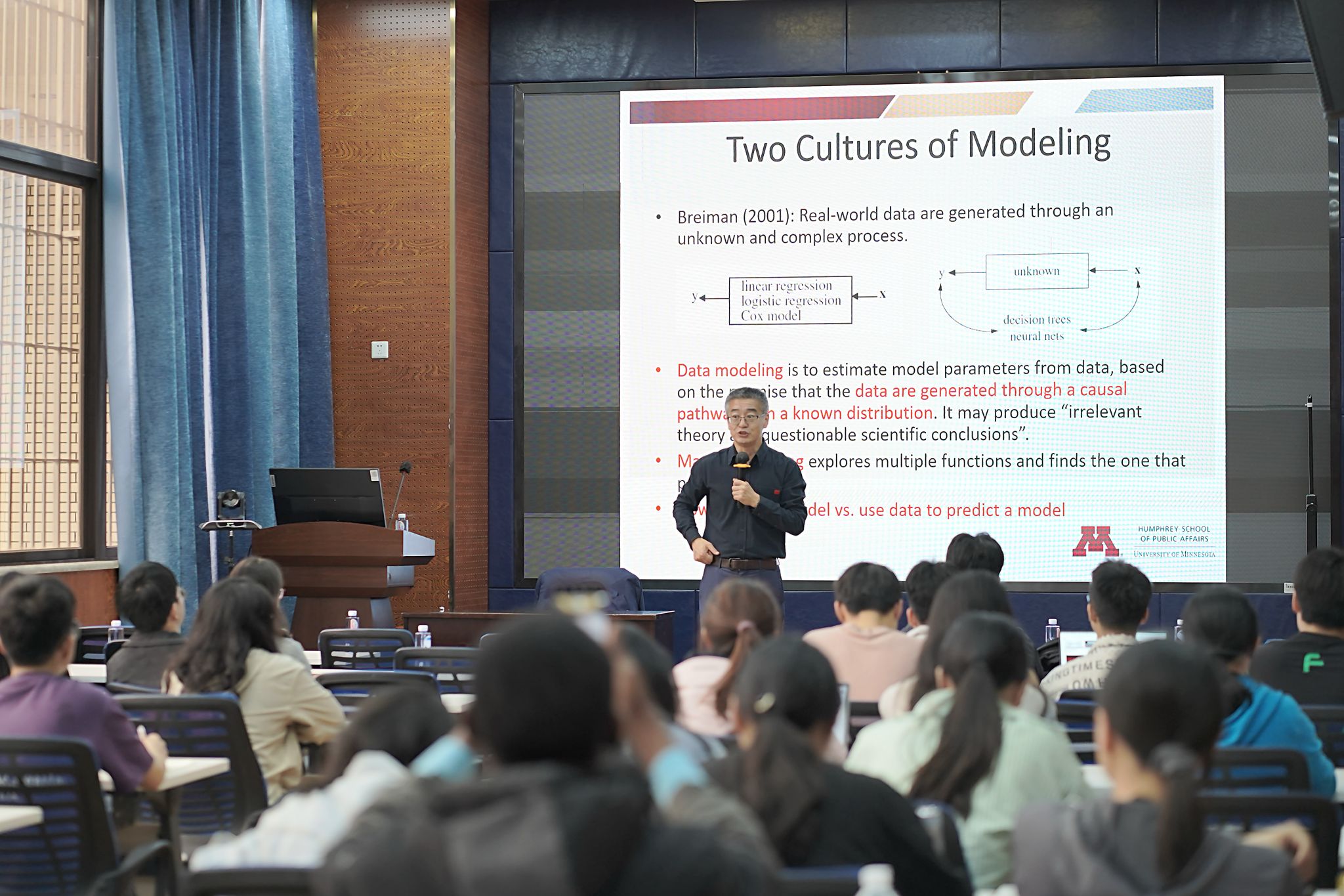 曹新宇教授以文献《Statistical Modeling: The Two Cultures》为切入点,系统梳理了数据分析研究的范式演变。他从传统统计模型中的线性相关、独立同分布等基础假设出发,深入剖析了经典假设在复杂现实数据中的局限性。