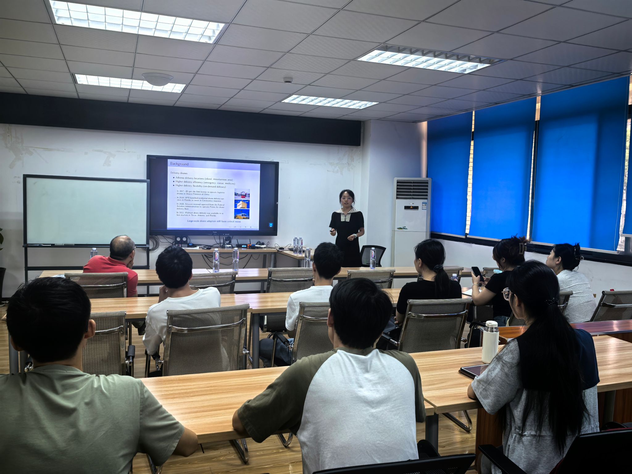 讲座问答环节,师生围绕 “模型实际应用场景拓展”“算法适配不同城市空域政策”“无人机与卡车协同的成本效益” 等问题深入交流。刘文倩老师结合研究案例与数据,阐释模型参数调整、算法优化方向,为师生开展智慧物流相关研究提供思路。
