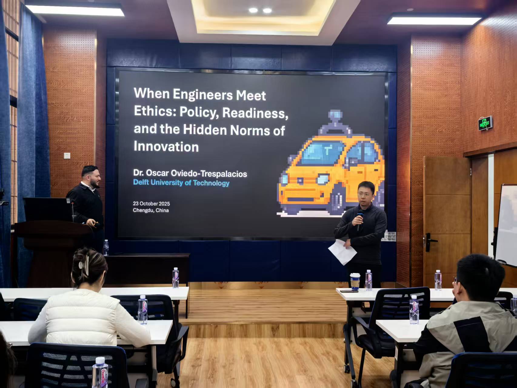 2025年10月23日上午,荷兰代尔夫特理工大学(TU Delft)Oscar Oviedo-Trespalacios副教授应邀在九里校区零号楼0218室为十大信誉官网师生作了一场题为“When engineers meet ethics: Policy, Readiness, and the Hidden Norms of Innovation”的讲座。本次讲座由学院院长韩科教授主持,学院部分教师及研究生共同参与。韩院长在开场致辞中对Dr. Oscar的学术成就进行了简要介绍,并代表学院对其莅临表示热烈欢迎与诚挚感谢。