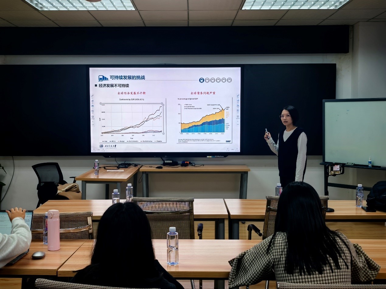 陈梅倩老师围绕全球可持续发展面临的多重挑战展开分享。面对气候变化、环境退化、贫困等全球性问题,结合 2015 年联合国发布的《变革我们的世界:2030 年可持续发展议程》,她详细介绍了涵盖经济、社会与环境三大支柱的 17 项可持续发展目标(SDGs)。针对中国在可持续发展领域的进展与面临的不确定性,陈梅倩老师构建了集成系统动力学模型,用于评估中国实现 SDGs 的进程并开展政策模拟分析。
