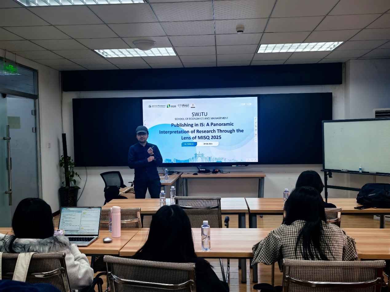 苏通老师围绕信息系统这一连接技术、人类行为与组织管理的交叉学科,以 MIS Quarterly(MISQ)2025 年主编社论为核心展开分享。他系统梳理了 IS 研究的发展脉络,详解描述性、关系性与实验性三类基本研究取向,强调理论建构在学术研究中的关键作用,并介绍了问卷调查、实验设计等常用研究方法。同时,讲座还涵盖 IS 领域主要学术期刊、主流研究话题与投稿标准,深入分析该领域研究趋势与方法演进,并对未来研究方向进行了探讨。
