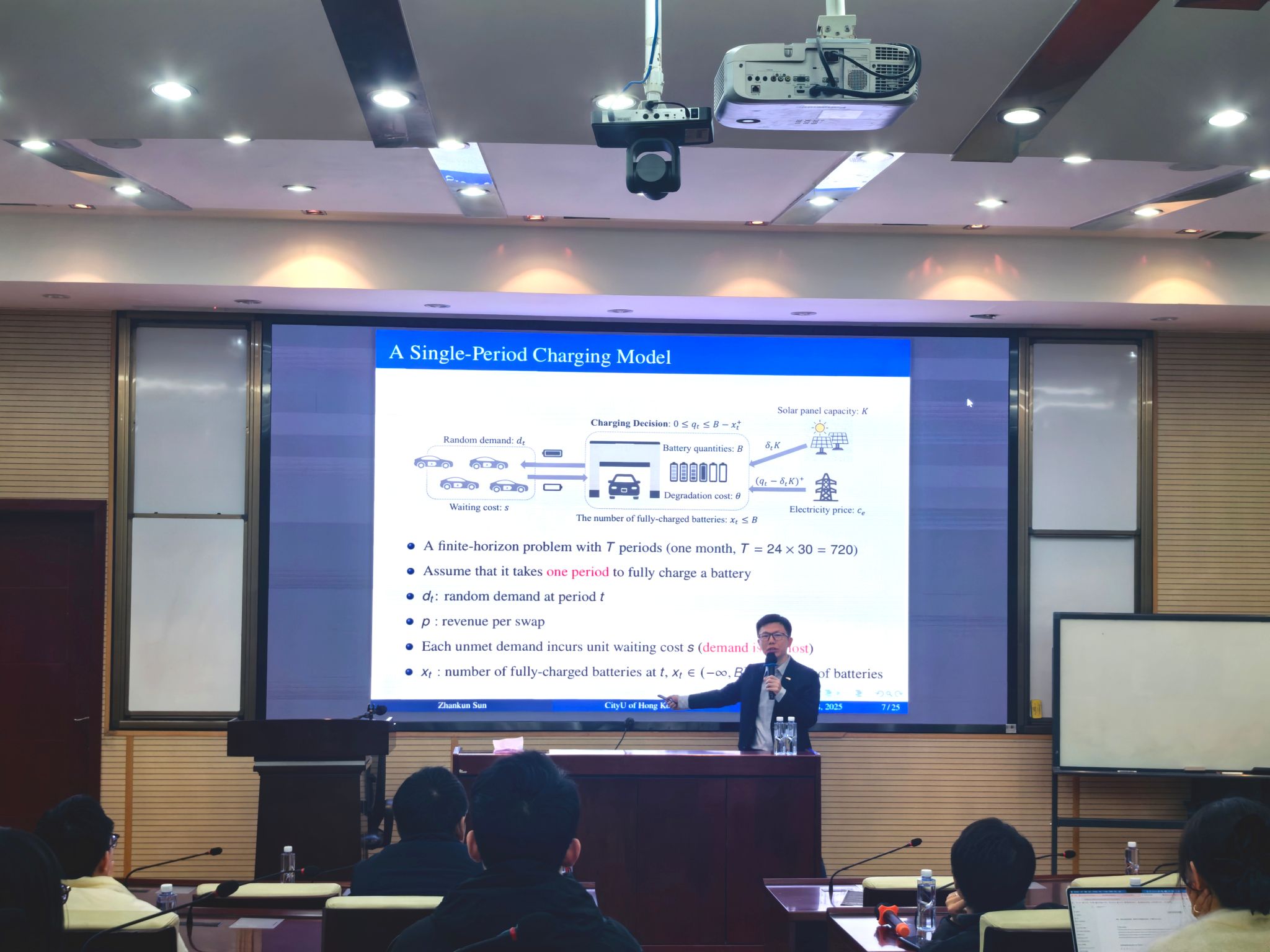 在报告环节,孙老师围绕新能源汽车补能服务品质提升的关键挑战进行了深入剖析。他指出,换电为新能源汽车提供了一种快速能量补给解决方案。在综合考虑客户到达的随机性、可再生能源发电的不确定性以及时变电价等现实因素的基础上,孙老师又结合充电峰值需求水平与常规电能消耗成本,将需量电费纳入换电站运营成本,并以此构建有限阶段动态规划模型,确定了换电站电池最优充能决策。
