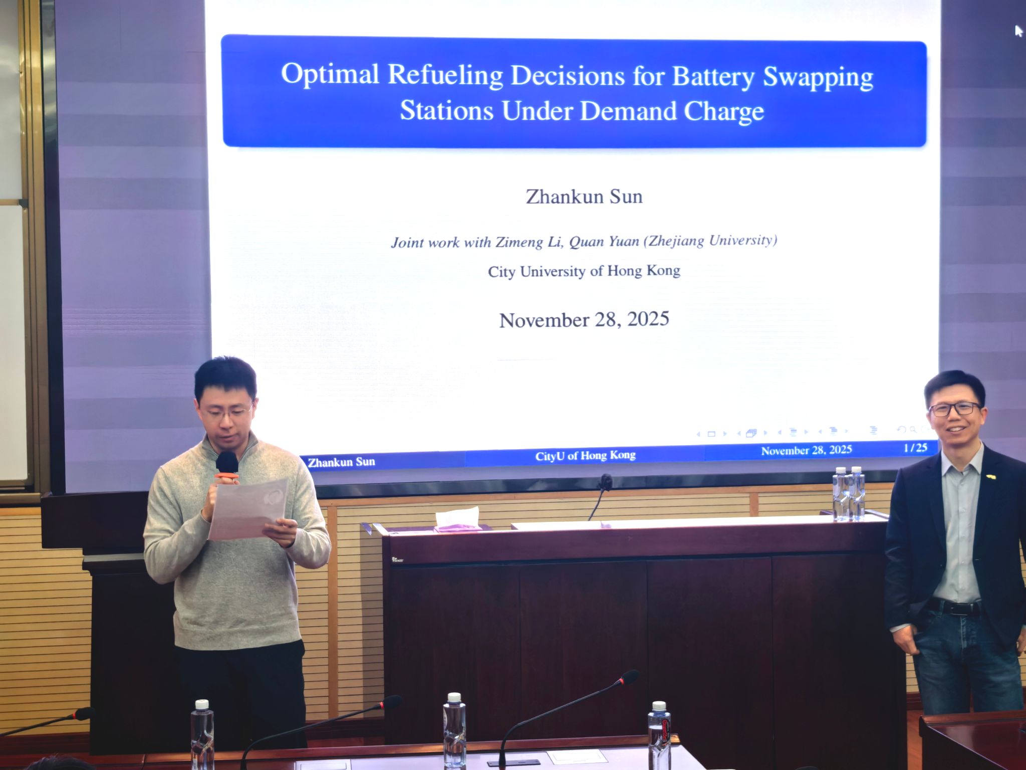 2025年11月28日上午,澳门十大信誉好的网站“创源大讲堂”之“经世致用 雅集新篇”校外学者系列讲座于九里校区零号楼0212室圆满举办。此次讲座由香港城市大学商学院孙占坤副教授主讲,讲座题为“Optimal Refueling Decisions for Battery Swapping Stations Under Demand Charge”。讲座由澳门十大信誉好的网站院长韩科教授主持,学院师生踊跃参与。