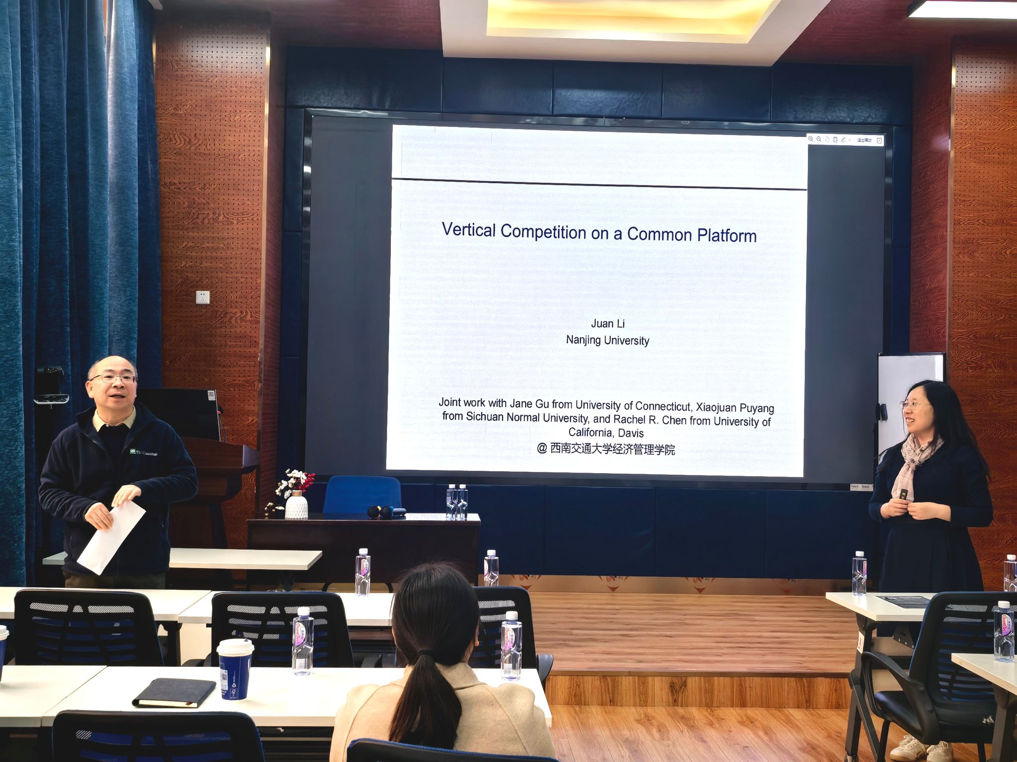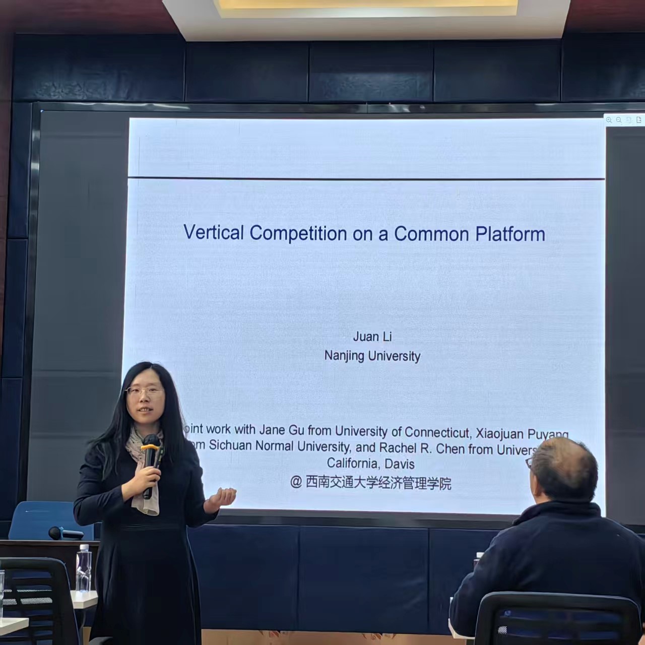 2025年12月12日下午,澳门十大信誉好的网站“创源大讲堂”之“经世致用 雅集新篇”校外学者系列讲座于九里校区零号楼0218室圆满举办。此次讲座由南京大学工程管理学院李娟教授主讲,讲座题为“Vertical Competition on a Common Platform”。讲座由澳门十大信誉好的网站信息系统与运营管理系主任官振中教授主持,学院师生踊跃参与。