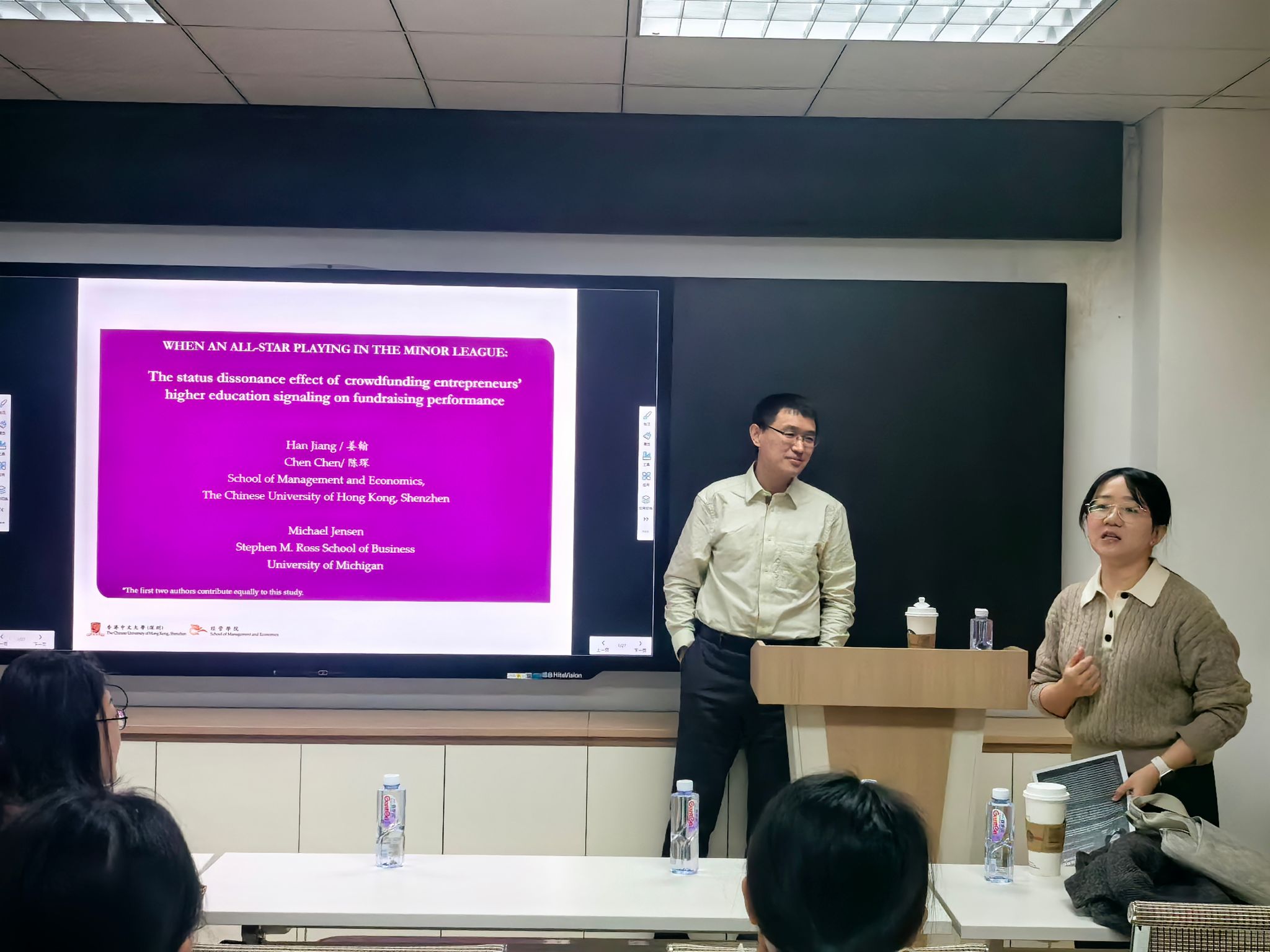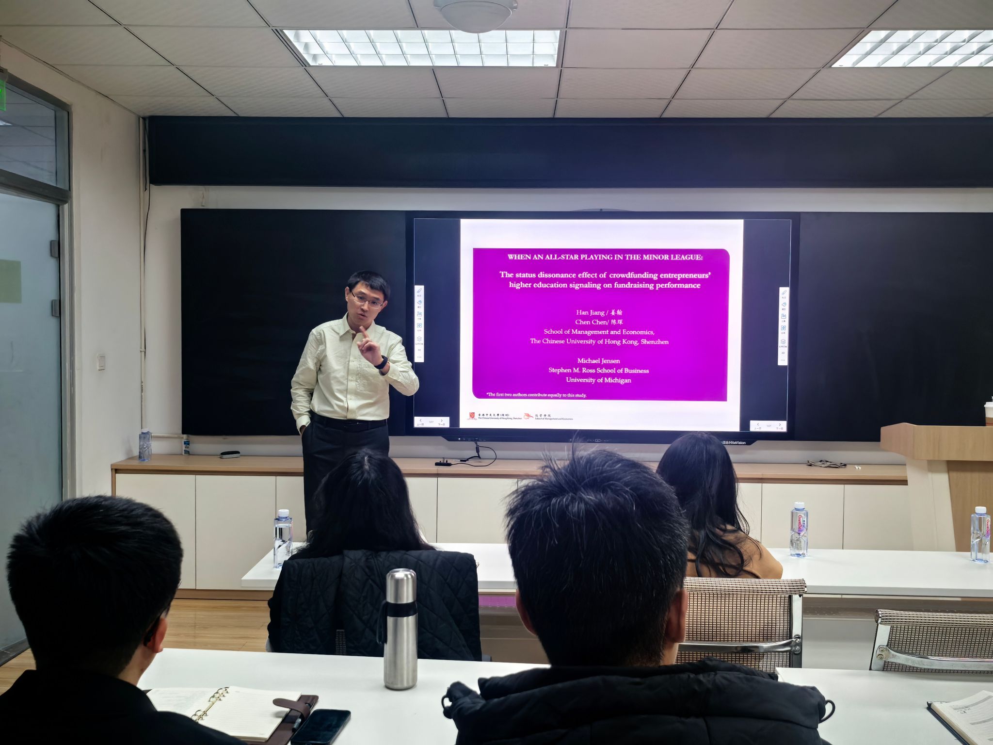 2025年12月23日上午,香港中文大学(深圳)经管学院姜翰副教授应邀为十大信誉官网师生带来一场题为“An All-star Starting to Play in the Minor League: The Status Dissonance Effect of Crowdfunding Entrepreneurs’ Educational and Professional Rhetoric on Fundraising Performance”的学术讲座。本次讲座由澳门十大信誉好的网站创新创业与管理学系陈轩瑾老师主持,学院部分师生参加了此次活动。讲座伊始,陈老师介绍了姜老师的学术背景与成就,并对姜老师的到来表示热烈欢迎。